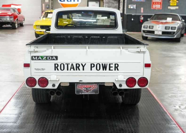 This 1977 Mazda Rotary Pickup is a rare and exciting compact truck powered by a 1.3L 13B twin rotor Wankel engine paired to a 5-speed manual transmission with a 3.91 rear gear ratio. It features power brakes, front disc brakes, and rear drum brakes, making it both responsive and fun to drive. The white exterior paint is paired with a striking black vinyl interior with white houndstooth inserts. Upgrades include a QFT 4-barrel carburetor, electric fuel pump, and 16" MB Motoring wheels wrapped in Hankook Ventus V2 Concept 2 tires. A unique blend of vintage style and rotary performance.