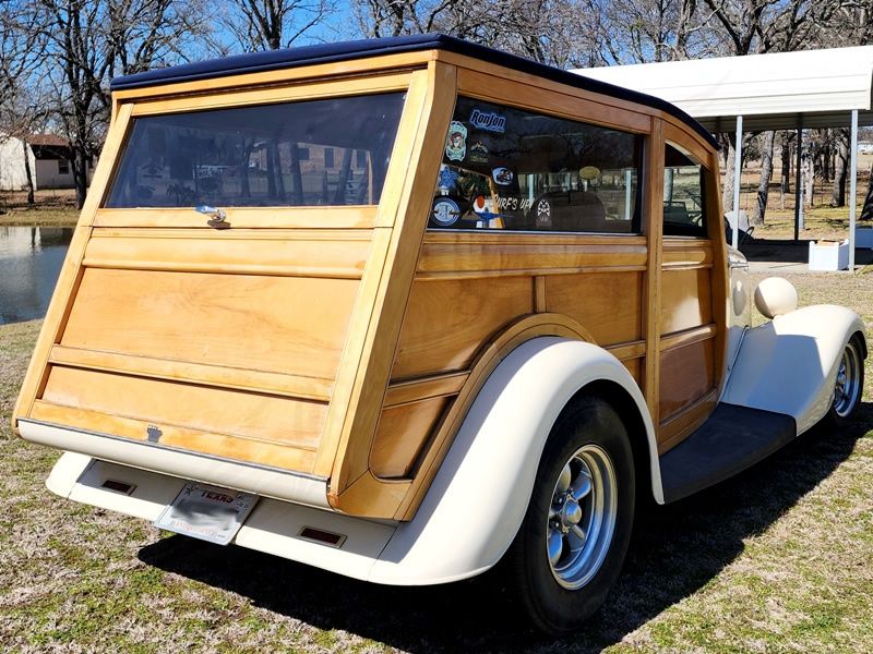 The Woodie or (Woody) station wagon took inspiration from fine wooden furniture to invoke that same feeling of class when it comes to automobiles. Completing the passenger compartment of cars in wood was a popular practice back in the day and was a modern interpretation of horse drawn carriages. These cars were typically created by large third party coachbuilders and occasionally by local carpenters. They were sold in limited production numbers and eventually strength, cost, and durability led to the wood constructed cars to be abandoned. That being said they are still extremely popular in the classic car world and are very much alive. The National Woodie Club is still very active and host events all across the country. This '33 is the two door version and was constructed by Hercules Motor Car Company out of Tampa, Florida. This was a popular Woodie builder and were still in business until recent years. If you look them up online you will see some articles discussion the very talented builders there. According to the owner of Hercules this car is one of the "New Generation" cars and was the 4th created out of a total of 133. This car has a combination of a custom steel body, custom wood paneling and fiberglass fenders. It is painted in White which pairs nicely with the wood paneling which we think is Hard Maple based on our research. It has a nice Blue canvas top in place that is in good condition. The glass on it is all good throughout and in typical Woodie style it has lift up windows instead of roll up windows. The chrome grill looks good and is framed by the larger style circle headlights. The car rides on American Racing Torq Thrust wheels and it has a taller tire in rear for a slight rake.
