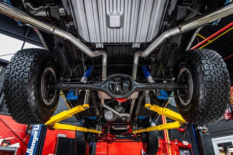 Inside, this truck has been beautifully restored as well! The deluxe interior has been fitted in Black Carpeting and with a Dark Multi Colored Bench Seat! On the dash is wood Knurled Trim, Stock gauges, Upgraded Aftermarket Radio, Wooden Steering Wheel, HCAV Controls, Column shifter, & 4x4 selector on the floor. Underneath, this F-150 features a new Exhaust, 4in Lift, with a black painted frame and Underside!