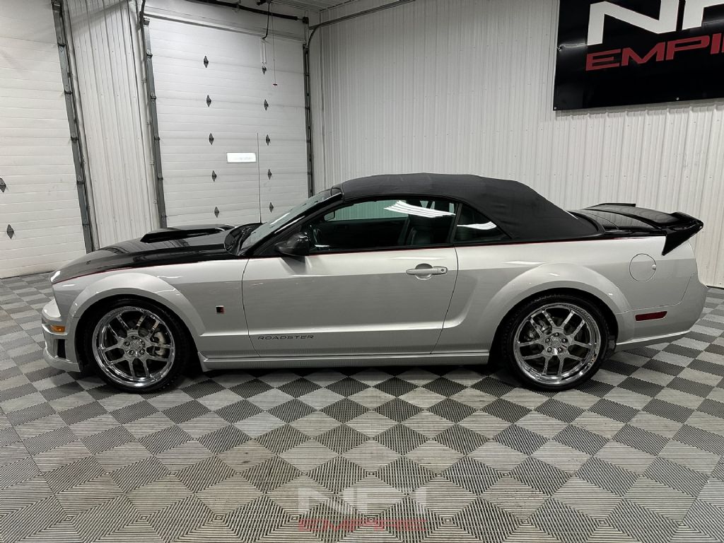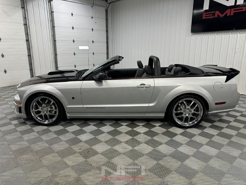Roush then converted it into a Roush Roadster using their Roadster/Stage 1 package. The car wears the full Roush aerobody kit with unique front fascia, chin spoiler, hood scoop, side skirts, rear valance, and rear wing. The factory wheels were replaced with 20-inch forged chrome Roush wheels wrapped in performance tires. A Roush sport-tuned suspension with lowering springs, revised shocks, and jounce bumpers gives the car a lower, more purposeful stance and sharper handling. Inside, it features custom two-tone leather seating (black top) with Roush logos, a Roush gauge cluster and white-face gauges, billet aluminum pedal kit, Roush-embroidered floor mats, and Roadster-specific graphics and interior trim. Exterior Roush details include the fender badges, windshield banner, locking lug nuts, and the Roush engine-bay plaque and door sill plates, all confirming its authenticity as a serialized Roush build.