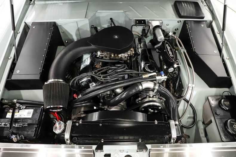 ENGINE COMPARTMENT: Very meticulous with many custom upgrades! At the center of it all is a crate 302-292hp motor from Phoenix Engines. It has a Comp cam, aluminum intake, Edelbrock 600 carb, Pertronix electronic ignition and shorty headers with black Cerakot. Wild Horses staggered 4 core radiator keeps it running cool. Vintage Air heat and a/c system keeps the passengers comfy. The driver will appreciate the power steering and Hydroboost power brakes with a wilwood master cylinder. Custom made stainless fillers, 2 tool compartments, vented inner fender shields and a custom air intake. The battery is secured, it has upgraded gas hinges, squirters are hooked up etc. It is show quality in here, painted slick and even the nuts and bolts look new!