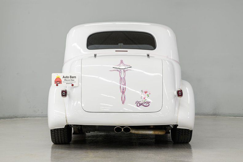 The chopped sedan has an all-steel body with fiberglass fenders, hood and running boards. A handsome White finish is accented with striking purple ghost flames. A set of 15" classic American racing chrome spoke wheels that mount radial tires provide the final touch to the handsome exterior. The doors are equipped with remote poppers and manual release.
