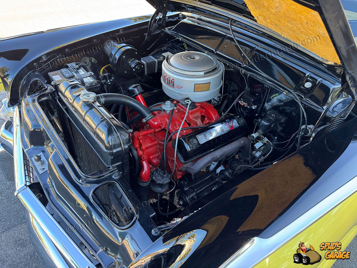 Power-Train/Chassis: Original presentation/restoration, 272 cu-in Y-Block V8, 162HP @ 4,000 rpm, 258 lb-ft torque @ 2,200 rpm, 2bbl carburetor, OEM oil-bath air-filter assembly, "Overdrive" 3-speed manual transmission, dual-exhaust (upgrade), OEM standard semi-floating axle 3.54:1 ratio, non-modified chassis & suspension, four-wheel drum brakes and emergency brake.