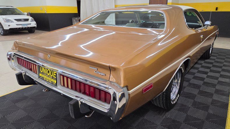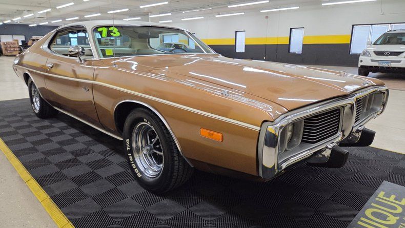 1973 Dodge Charger in original Aztec gold with white vinyl canopy roof