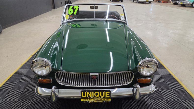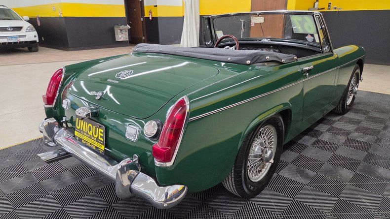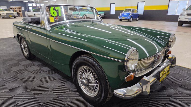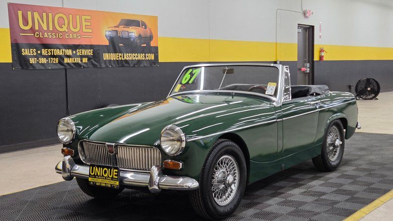 1967 MG MK2, a classic British sports car that features a 1098cc inline four-cylinder engine with a dual carburetor setup and a Five-speed manual transmission. The body is painted a color close to British racing green, with chrome brightwork and spoked knock-off wheels. Minor imperfections such as a few paint blemishes, and a rip in the vinyl seat bolster. The convertible folding top is like new, and easy to manually operate, with clear plastic rear windows and side glass that fit well. The interior features black vinyl seats with white piping. Speedometer, odometer, and tachometer are noted as inop. The heater blower motor works well, the windshield wipers are inop. Turn signals, oil pressure, and temp gauge are reading. Clean tidy engine bay with several new looking components. On the road the smooth running nature, ease of handling, and responsive fun feel is evident. Despite its compact size, the car offers headroom even for a taller driver.