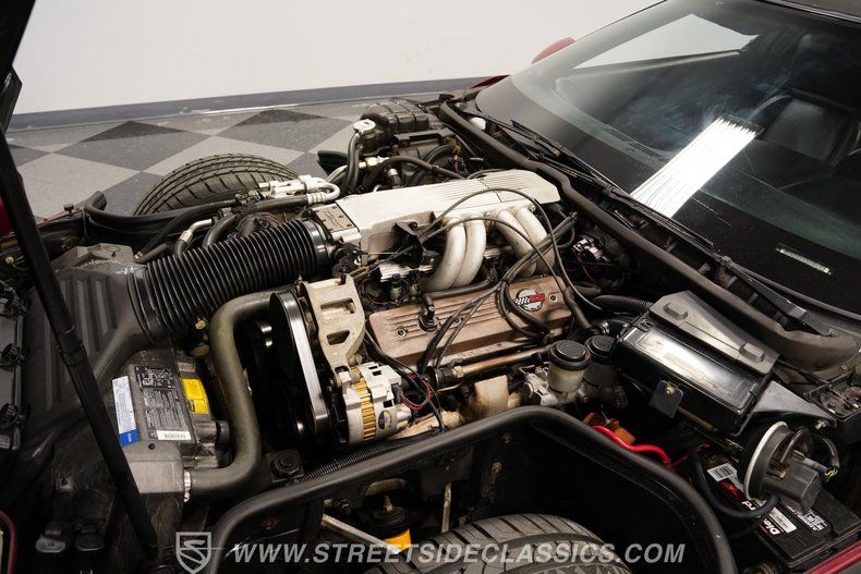 Under its front-hinged hood, we find a 5.7-liter L98 V-8 engine. With its stout iron block and lightweight cylinder heads, the L98 uses Tuned Port Injection in conjunction with an in-tank fuel pump to help this Corvette generate 245 horsepower and 345 pound-feet of torque when it rolled off the assembly line. Power is routed through a 700R4 four-speed automatic transmission before heading out to the rear, where it transfers those ponies to the pavement via 17-inch sawblade-style factory wheels shod in wide 275/40R-17 tires.