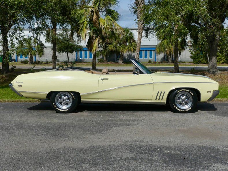 This Skylark wears the factor colors of Cameo Cream with a Buckskin convertible top and Buckskin interior. Cragar 5-spoke wheels have been added, which are always a nice upgrade. The steering wheel and radio have also been swapped for functionality and good looks. There is an upgraded intake, Edelbrock carburetor, and HEI distributor for a bit more power from the 455.
