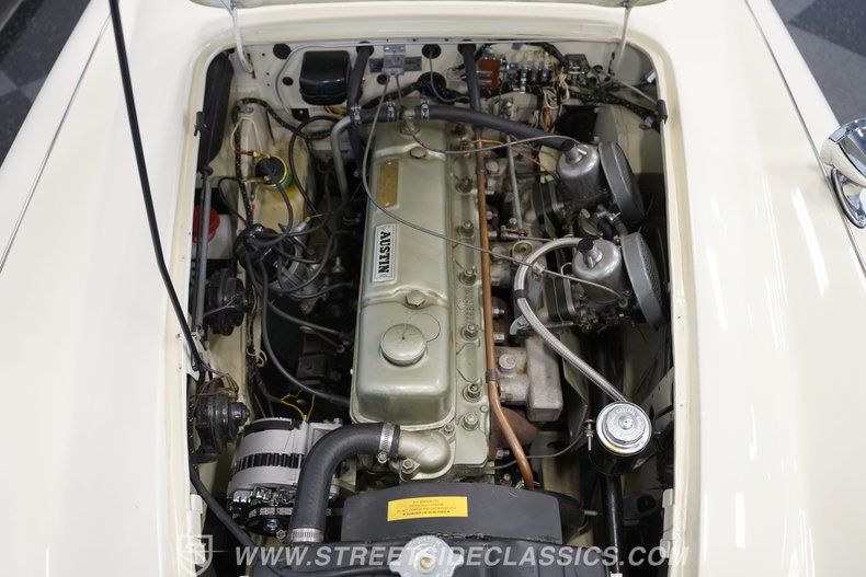 Under the hood, this Austin Healey boasts a 2.9-liter engine with dual SU 1-barrel carburetors, paired with a 4-speed manual transmission featuring an electronic overdrive for added cruising ease. The drivetrain upgrades contribute to a smooth and responsive ride, making every journey enjoyable. The car's mechanical integrity is complemented by its factory solid axle, front disc brakes, and rear drum brakes, ensuring confident handling and stopping power. Well-maintained suspension components and steering provide a balanced driving feel, making this classic as functional as it is stylish.