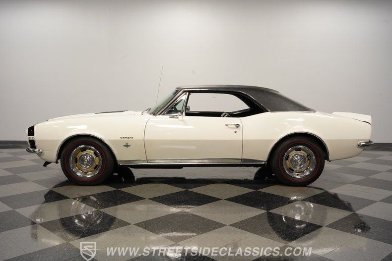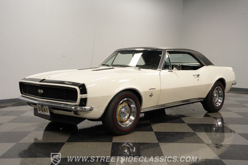 This 1967 Chevrolet Camaro SS/RS 350 exemplifies first-year Camaro excellence. Draped in Ermine White with a black vinyl top and bold black front bumblebee stripes, this coupe's profile is a study in classic muscle car design. The body lines flow seamlessly from the aggressive front fascia to the rear spoiler, accentuated by gleaming chrome bumpers and trim. Riding on 15-inch Rally wheels wrapped in BF Goodrich redline tires, this Camaro's stance is superb. The exterior showcases meticulous attention to detail, from the hood louvers to the SS badging, creating a visual impact that defines the golden era of American performance.