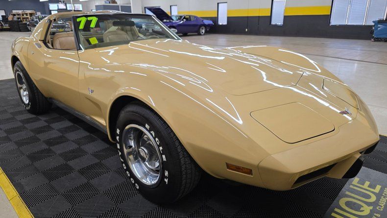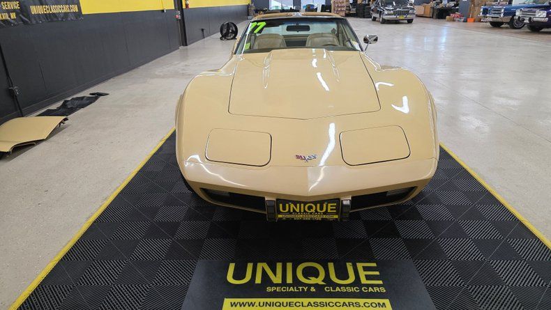 1977 Chevrolet Corvette with T-TOPS. A two-owner car, with the second owner having purchased it in 1984 and reportedly maintaining original mileage of just over 17,000 miles. The Corvette comes with its original NUMBERS-MATCHING 350 V8 engine paired with the NUMBERS-MATCHING automatic transmission. The exterior paint (paint code 80, tan buckskin) retains a glossy shine with minimal touch-ups, and the interior features a matching buckskin leather that remains in extremely nice shape, consistent with the low mileage claim. Equipped with power steering, power brakes, and air conditioning, the AC compressor is functional though it requires some attention since it operates on R12 refrigerant and does not blow cold air effectively. Recent service includes a new aluminum radiator. The passenger window requires some TLC to go up, the heater core is bypassed, and a rear bearing and control arm will need future attention. The car rides on white letter Goodyear Eagle ST radials on slotted wheels with Chevrolet Motor Division center caps, completing the authentic look. The gauges function, but for the clock, and a finicky tachometer. In the driving segment, the Corvette performs well, exhibiting smooth braking, solid cornering, and a comfortable ride. Comes with the storage bags for the T-Tops for when they are removed.