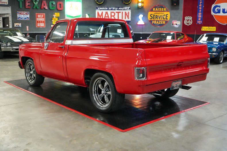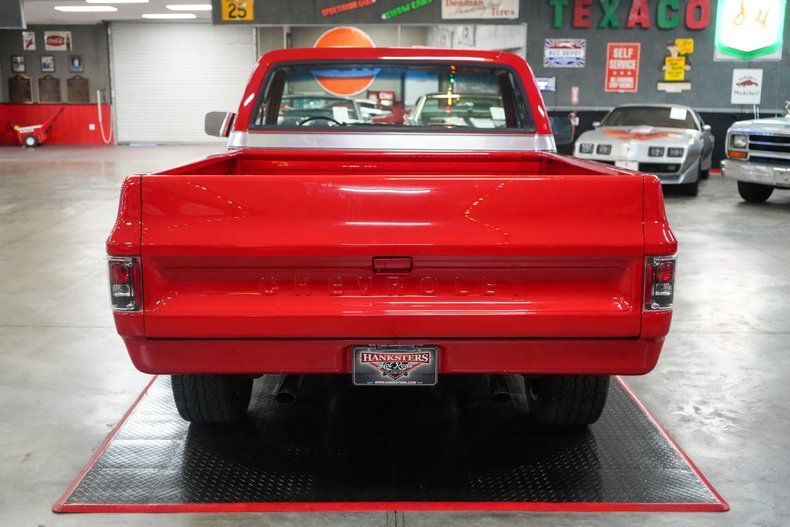 This 1977 Chevrolet C/10 Short Bed blends classic style with modern performance. Powered by a 350 Small Block Chevy V8 mated to a TH350 automatic transmission, it channels power through a GM 12-bolt rear end with 3.36 gears. Equipped with power steering, power brakes, and front disc brakes, it delivers a confident driving experience. The black cloth bench seat complements the bold red exterior paint, while 20" American Racing Torq Thrust chrome wheels and Toyo Proxes STII tires give it a modern stance. An Edelbrock intake, Holley carb, Champion radiator, and dual electric fans enhance cooling and performance.