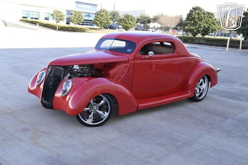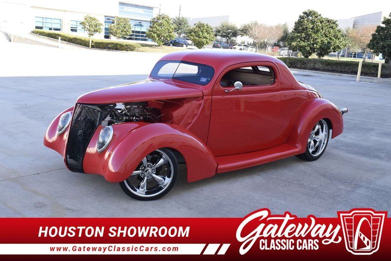 Gateway Classic Cars Houston Showroom is proud to present this 1937 Ford Coupe. This bright red beauty has been restored over the years bottom and out. The original engine block has been ripped out out for a more ever reliable 350 CID, which has been paired with 3-Speed automatic transmission. Of course these were the only things changed when doing the restoration, an all new interior was installed. When popping the doors open on this slick red ride, one will notice the all new door panels the new headliner, and the dash which is covered in a brown wood grain. Along with a new dash instrument a fresh brown synthetic leather seats have been installed along with a pioneer radio. The biggest upgrade this classic got was the vintage A/C that was will ensure the cabin is like a cold ice box.
