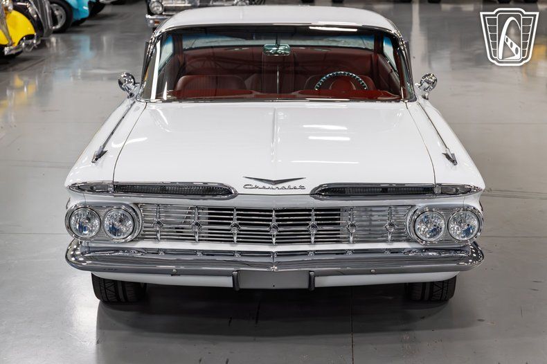 Gateway Classic Cars of San Antonio/Austin is excited to present this 1959 Chevrolet Impala. Finished in a crisp white exterior over a fully custom red leather interior, this Impala blends the unmistakable style of the late 1950s with modern performance and craftsmanship. Powering this build is a 6.2L V8 engine paired with a 4L60E automatic transmission, producing an estimated 500 horsepower as stated by the seller. The car underwent a four-year restoration, resulting in a striking combination of vintage design and updated engineering. This Impala features a range of performance upgrades and custom touches. It's equipped with an electronic air ride suspension for adjustable ride height and comfort, a 9-inch rear end, and a custom engine bay featuring a Champion Cooling aluminum radiator, Holley EFI, Hedman Hussler headers, and a Tru Trac air conditioning system. CPP power brakes and power steering provide modern drivability and confident control behind the wheel. The exterior retains much of its original charm, highlighted by original chrome as stated by the seller and refinished stainless steel that complement the clean body lines. It rides on Billet Specialties aluminum wheels wrapped in distinctive red sidewall performance tires that tie in beautifully with the car's interior color scheme. Inside, the Impala showcases a fully custom red leather interior and matching trunk upholstery, offering a cohesive and luxurious presentation. Power windows, air conditioning, and an AM/FM radio add comfort and convenience for cruising. This 1959 Chevrolet Impala represents a blend of classic American design and modern performance. With its detailed restoration, custom craftsmanship, and an estimated 500 horsepower stated by the seller, it stands as a remarkable interpretation of one of Chevrolet's most iconic models.