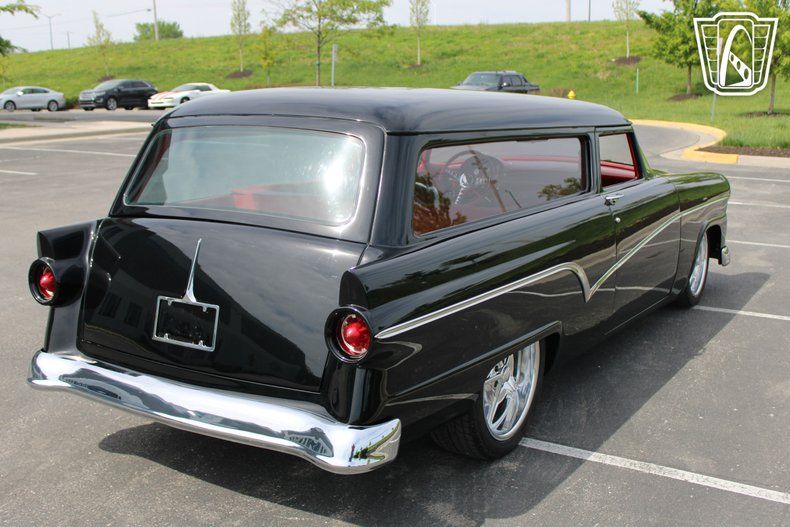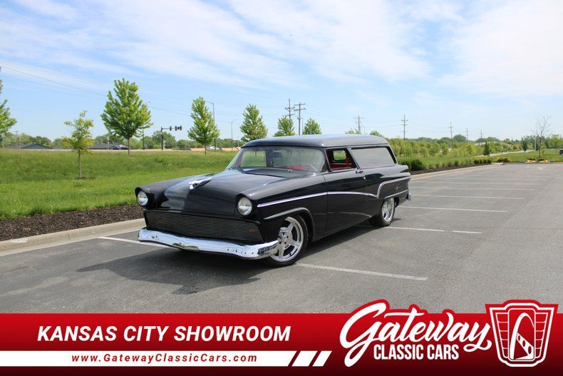 Gateway Classic Cars of Kansas City is proud to present a blend of classic style and modern performance with this stunning 1956 Ford Ranch Wagon Pro-Touring Restomod. This iconic vehicle captures the essence of mid-century American automotive design, featuring a sleek black exterior that exudes timeless elegance. The bold color choice is complemented by a striking bright red leather interior, offering an inviting and luxurious cabin that will turn heads wherever you go.