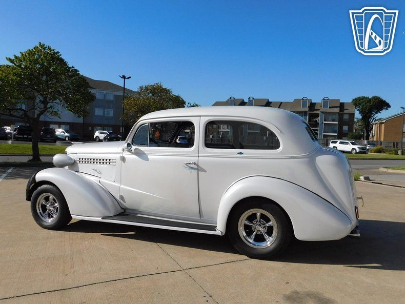 Gateway Classic Cars of Tulsa is proud to represent this slick 1938 Chevrolet Master Deluxe, a stunning example of vintage automotive craftsmanship. This vehicle boasts a pristine pearl white exterior that exudes elegance and sophistication, making it a head-turner wherever it goes. Complementing the exterior is a luxurious blue and white faux leather interior that is incredibly soft, offering a striking contrast that enhances the overall aesthetic appeal.