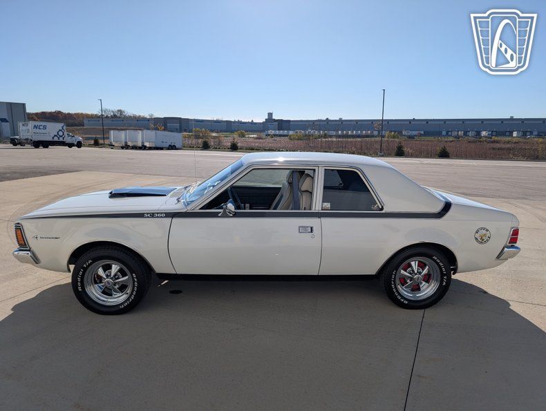 Safety and comfort are further enhanced with the inclusion of seatbelts and radial tires, providing peace of mind on the road. The vinyl interior not only adds to the vehicle's classic charm but also offers durability and ease of maintenance. This tribute to the AMC Hornet SC/360 is a wonderful blend of style, performance, and nostalgia, making it a standout choice for enthusiasts of classic American cars.