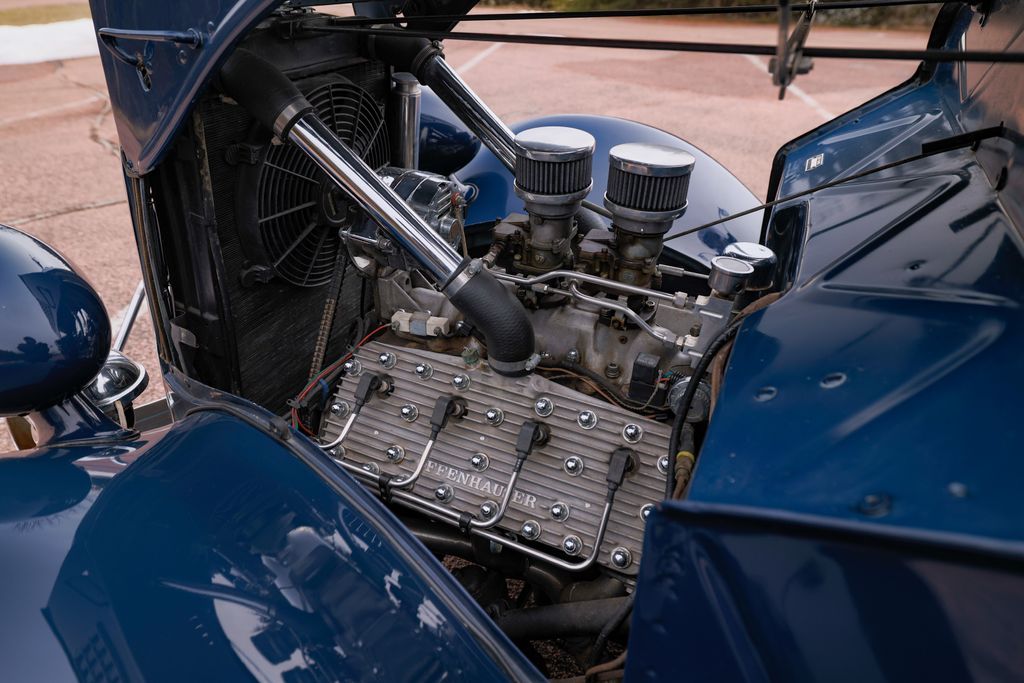 239ci Flathead V8 (59AB block) | Offenhauser aluminum heads | Dual carburetors | 4-speed manual | RWD | Washington Blue exterior | Tan mohair interior | Steel body | Hydraulic brakes | 16" Kelsey-Hayes wire wheels | Wide whitewalls | Factory rumble seat | 11369 miles showing