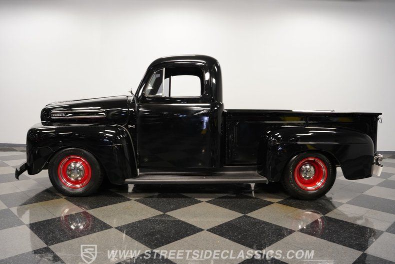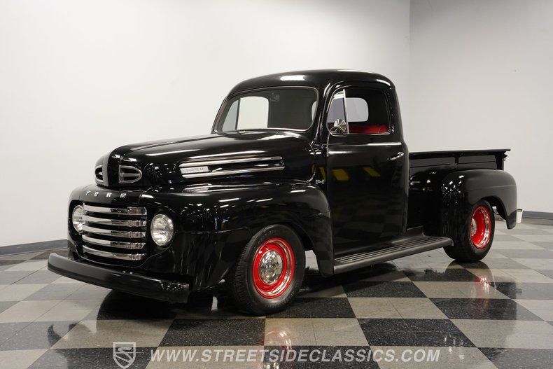 Dressed in attention-commanding black paint and wearing an assembly of bright work that's in consistently good shape, this 1950 Ford F-1 is an outstanding representative of the class of working trucks that rolled off the assembly line to recapture the enthusiasm of the public as WWII drew to a close. It's a sharp-looking pickup, with a subtly lowered stance and painted steel wheels that complement its shortbed configuration nicely. Even better, this classic has been upgraded with some key mechanical components that put its drivability on a par with its timeless good looks, so you'll enjoy taking this venerable truck on the road every bit as much as you will gazing at it as it holds court in your garage.