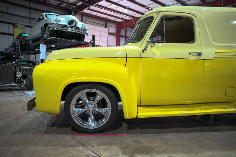 GR Auto Gallery is excited to present this 1955 Ford F100 Panel Truck finished in a striking two-tone Golden Rod and Sandstone White. The bold louvered hood, rolled rear pan, and front tilt hood showcase custom touches that separate this truck from the average restoration. Riding on polished 20-inch American Racing chrome wheels, it has an unmistakable stance that blends vintage style with modern flair.