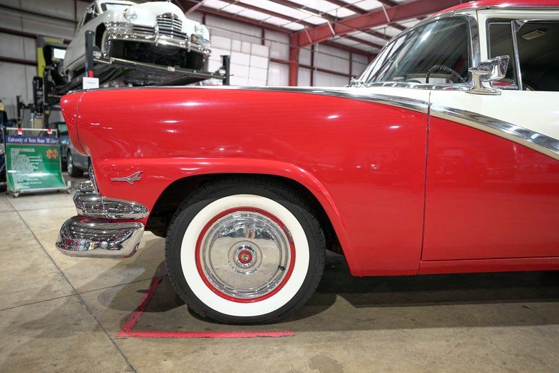 GR Auto Gallery is excited to present this 1956 Ford Fairlane Town Sedan. Finished in the classic two tone combination of Colonial White and Fiesta Red, this Fairlane captures the spirit of mid fifties Americana with its sweeping chrome trim, full wheel covers, and elegant stance on whitewall tires. The brightwork glistens against the bold paint, and subtle touches like the red wheels with chrome hubcaps give it an extra dose of personality. This car is a true snapshot of Ford's styling leadership in the era of fins and flash.