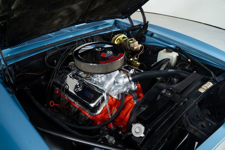Finished in striking Grotto Blue with a white nose stripe, this 1968 Chevy Camaro has a bold, aggressive presence that stands out immediately. The blue vinyl interior features bucket seats, a center console with gauges, and a tilt steering wheel, creating a cockpit that feels purpose-built for spirited driving. Power front disc brakes add confidence, while the 14-in front and 15-inch rear Rally wheels wrapped in new BF Goodrich Radial T/A tires give the car a proper stance.