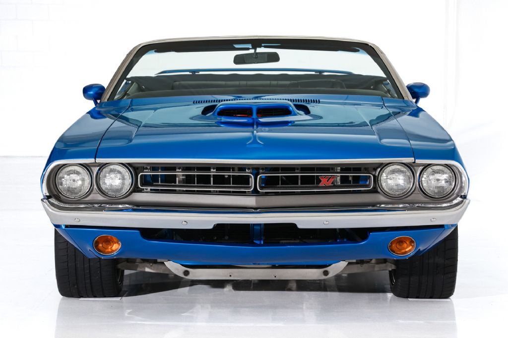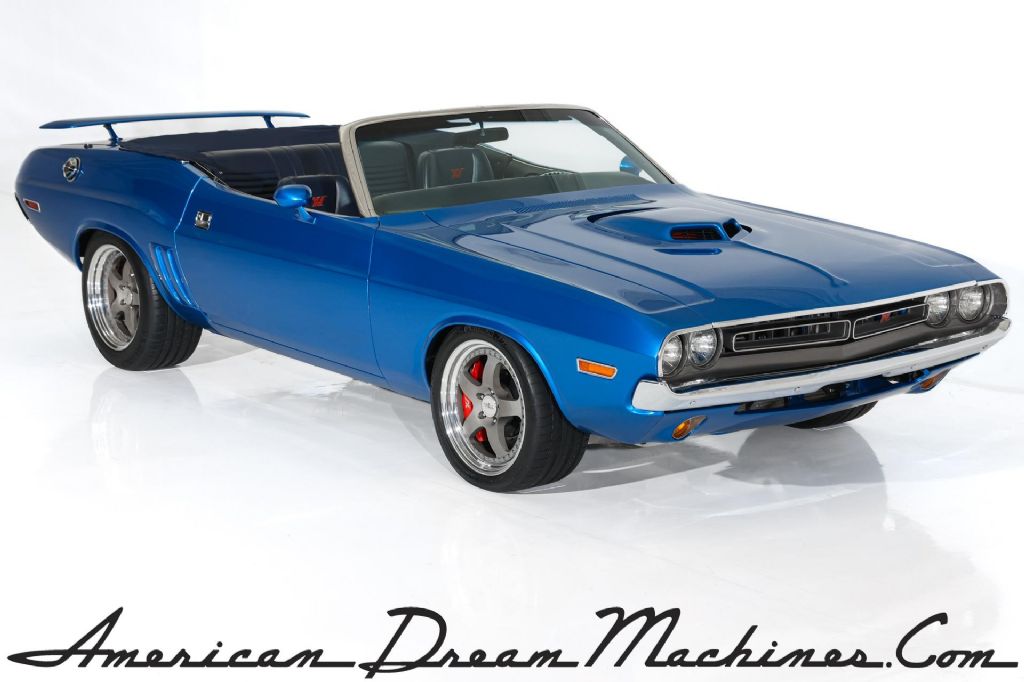 Viper Blue Metallic, Pro-Tour Challenger convertible, professionally built by XV Motorsports who is a high-end builder of Mopar touring cars, powered by a 600 horsepower Hemi and a very bad attitude. This Dodge Pro-Tour convertible is basically a hand built Mopar supercar with 1971 Challenger E Body that was re-engineered by XV Motorsports from the ground up with performance and creature comfortS in mind, with fully modernized chassis and suspension, Recaro leather, heated power seats, Tremec Pistol Grip 6-speed, 4-wheel disc slotted brakes, power rack and pinion steering, XV Motorsports custom gauges, tilt steering, power windows and locks, dark blue canvas power top, rolling on KINESIS Custom Wheels and Michelin performance rated radial to put the rubber to the road.