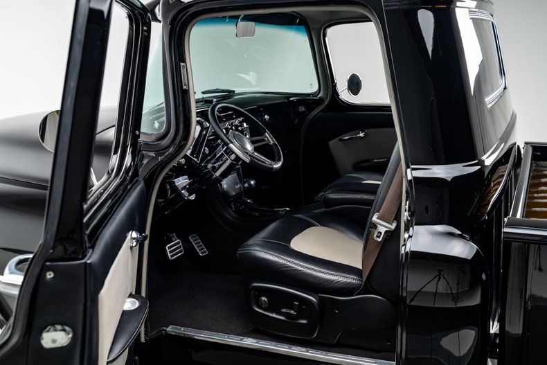 The body was taken through a ground-up restoration and finished in deep, jet-black two-stage paint that gives the truck a formal, tuxedo-like presence. Panel fit is excellent throughout, with straight body lines and clean gaps that far exceed factory standards. Restored chrome adds crisp contrast, while details like the cab visor, LED lighting, and retractable Nomad-style tailgate cable tethers sharpen the truck's finished look. The stance is dialed in on 15" steel wheels wrapped in BFGoodrich Silvertown Radials with wide whitewalls, giving the truck undeniable curb appeal. Out back, the finished oak bed floor with polished stainless slats delivers classic style with durability to match.