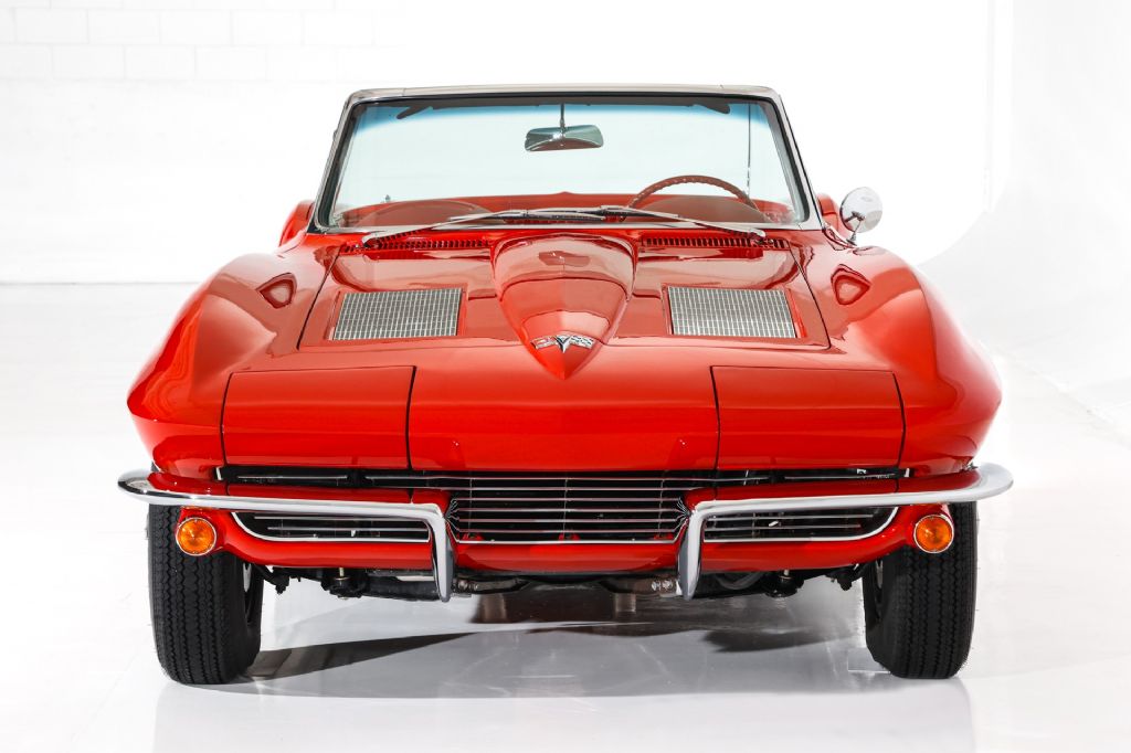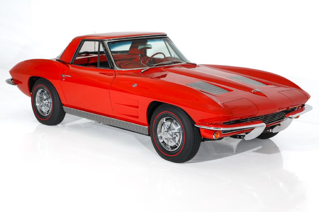 Stunning Riverside Red 1963 Corvette Stingray roadster with white soft top and painted to match hardtop. This Corvette has had and extensive restoration and has some very desirable upgrades. The stingray body is has great lines and panel fitment and was professionally painted in correct code-923 Riverside Red jeweled in lots of newer and polished chrome and stainless all the way around. The lush red interior is stunning, with newer red seat covers and features rare tilt steering column for a little more leg room and exceptional dash with restored instrumentation and clock, a new glove box door, lots of newer stainless trim, correct Corvette matching red 3 spoke aluminum steering wheel and newer Corvette stereo with a 10 disc cd changer in the back. Under the hood appears factory correct and show cases an upgraded GM 350 cubic inch crate engine with a little more horsepower, topped off with correct Corvette polished aluminum valve covers, correct Winters intake and chrome ignition shielding and correct factory chrome air cleaner for a factory correct, original appearance. Other desirable upgrades include newer Vintage A/C and a newer aluminum radiator to keep you and the car cool on those hot summer days. The Muncie transmission debuted in 1963 and this car retains its numbers matching 4-speed transmission to control the power and is backed by the stock rear end that has posi-traction and a heavy duty 4.11 gear. This American Dream Machine is rolling brand new Corvette full size spinner hubcaps and Coker Classic redline tires that match the car perfectly.