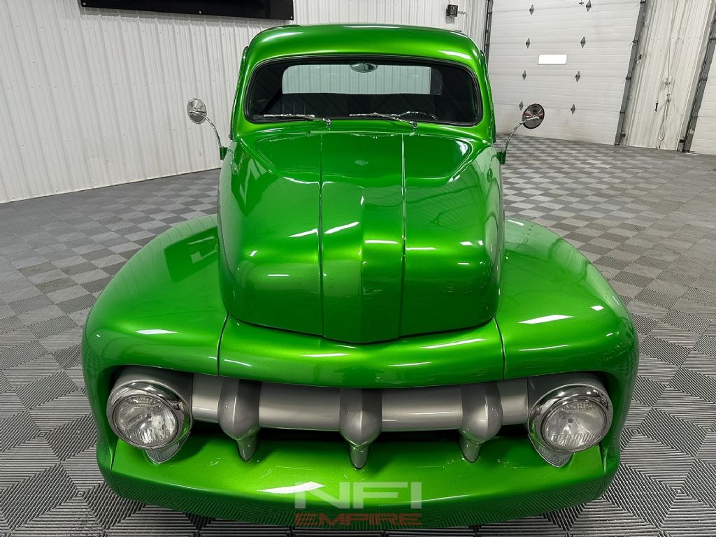This 1952 Ford F-1 blends classic pickup styling with modern drivability, finished in a striking green metallic paint that highlights the truck's classic post-war body lines. Light wood trim accents the running boards and the truck bed, adding a warm, period-appropriate contrast that complements the overall presentation.