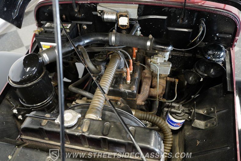 With is Maroon and Black paint scheme, whitewall tires, rear externally-mounted spare tire and chrome trim, this classic has an irresistible charm and character that turns heads everywhere it roams. The clean durable maroon and tan vinyl interior looks great. The dash retains its charming original gauge cluster with "Willys Overland" logo, and side curtains are included just in case it gets cold or rainy. A Boss Audio AM/FM/AUX/Bluetooth radio provides music for cruising.