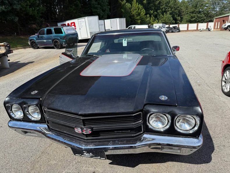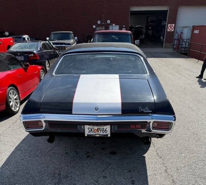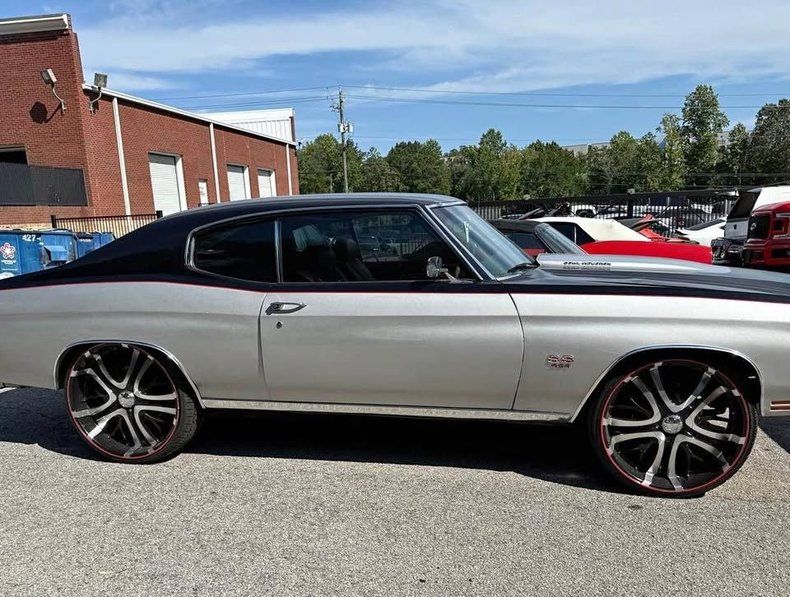 This 1970 Chevrolet Chevelle Malibu SS is a classic muscle car powered by an original 454 big block V8 paired with a 700R4 4-speed automatic overdrive transmission. It has been treated to extensive documented upgrades and repairs in 2025, including a fresh engine re-seal with new gaskets, fluids, oil pump, pickup, timing set, and cooler with hoses. A Dakota Digital dash cluster and sensors have been professionally installed, along with a touchscreen and JL Audio premium sound system. It also features a Vintage Air A/C system for added comfort. The exterior is described as silver with a black vinyl top, black racing stripes, and SS badging, while the interior is a custom two-tone black/gray setup with red piping. Rolling stock includes 22-inch custom wheels with red accents along with a recent repair and a new tire. Mileage is listed as 187,000 miles, and a Dakota Digital dash cluster has been installed.