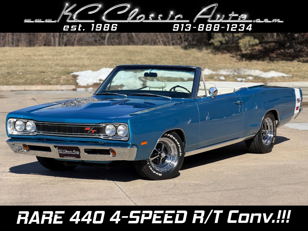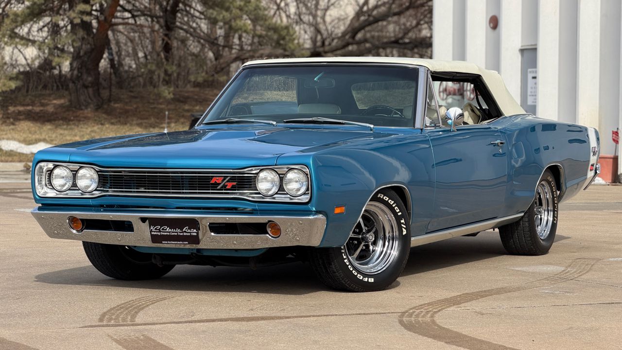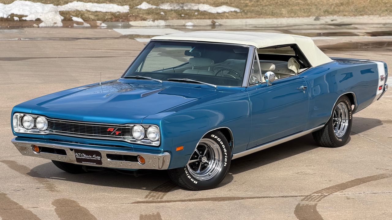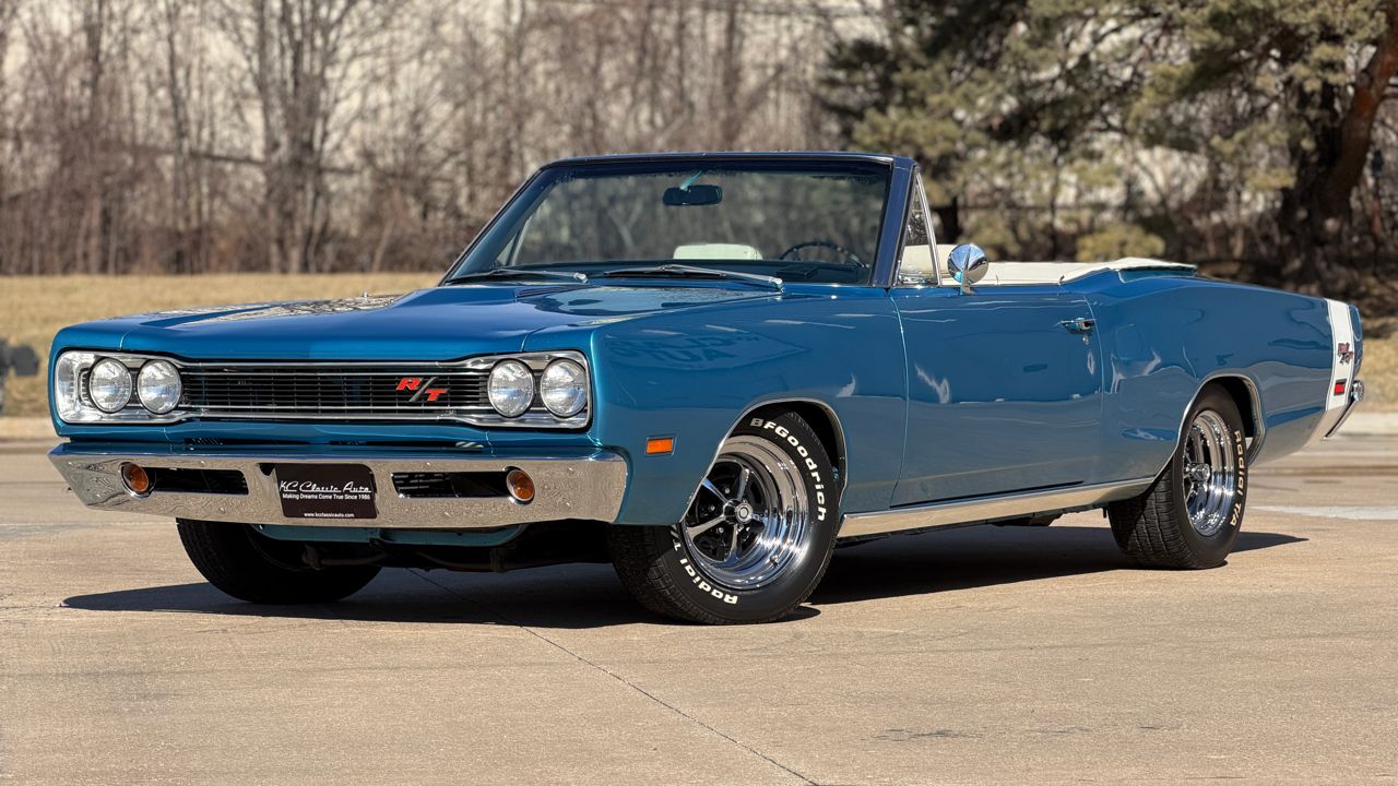 KC Classic Auto is proud to present this STUNNING 1969 Coronet R/T convertible, A.K.A. Rita!Less than 300 Coronet R/T convertibles were built in 1969, even less were 4-speeds with the Track Pack, making this a SUPER RARE car!!Beautifully restored and refinished in its original B5 Blue with white convertible top and white stripe (originally a stripe delete car). Body and paint are in great shape with a few minor flaws (see photos). The convertible top is in excellent condition with brand new hydraulic cylinders and hoses.The interior is in excellent condition. Originally Black bucket seats and center console, it now has beautiful white seats with center arm rest. Vintage Air Conditioning/heat has also been added, along with a Sony head unit with CD player.Powered by a 1970 date code 440ci Magnum High Performance engine, mated to a 4-speed manual transmission. Factory A33 Track Pack car with Dana 60 rear end, Sure Grip differential and 3.54 gears.Other factory options include: power steering, power convertible top, power brakes, full bright exterior trim, etc! Full breakdown of the fender tag:R22: AM RadioV88: Stripe Delete26: 26 Heavy-Duty RadiatorA33: Track Pak (Performance Axle w/ Sure Grip differential and 3.54 gearsB51: Power BrakesC16: Center ConsoleC55: Bucket SeatsM25: Wide Sill MoldingsM31: Belt MoldingsB5 B5: Bright Blue Metallic (Upper & Lower Body Color)P6X: Premium Black Vinyl Bucket Seat InteriorX9: Black Door Frame PaintB20: November 20 build date206816: Order Sequence NumberE86: 440ci Magnum V8 (High Performance 375 HP, 4-Barrel)D21: 4-Speed Manual TransmissionWS27: Coronet R/T Convertible Body StyleL9G: 375-horsepower 440ci V8 w/four-barrel carburetor; 1969 model year; Saint Louis, Missouri, assembly plant172122: Sequence number Visit KC Classic Auto online at kcclassicauto.com to see more pictures of this vehicle or call us at 913-888-1234.