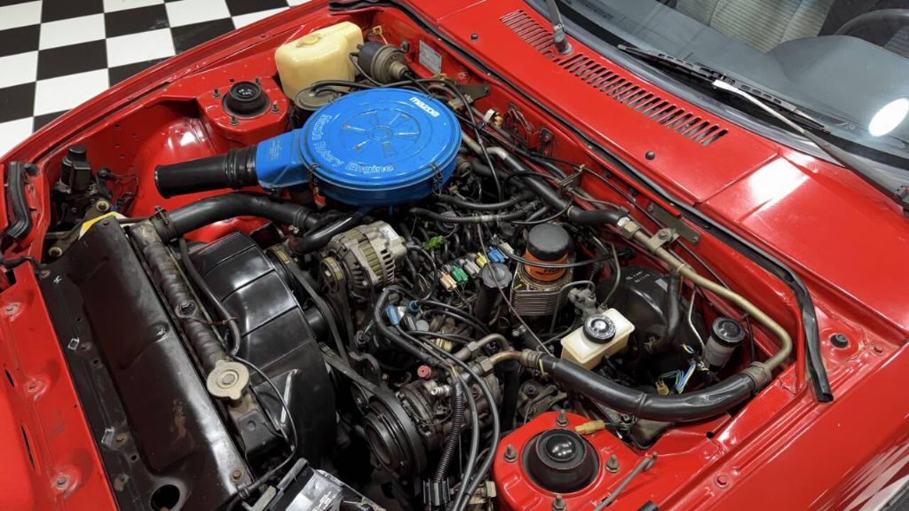 This RX-7 has a Factory-finished Sunrise Red (RH), the car features a sunroof, pop-up headlights, power-adjustable side mirrors, a rear spoiler, a rear-window wiper and louvers, with a power antenna. Four-spoke 13 alloy wheels are mounted with 185/70 Heritage Metric TR tires.