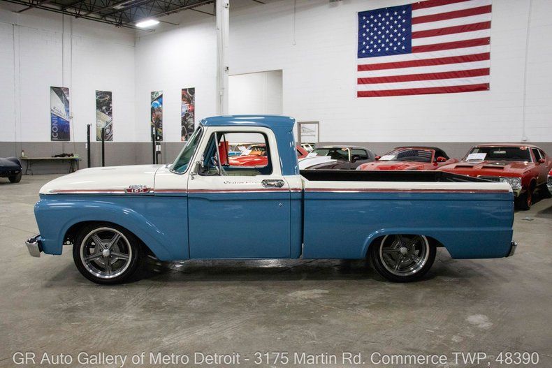 GR Auto Gallery is pleased to present this stunning 1964 Ford F100 for your consideration. This beautifully executed truck features an older rotisserie restoration and comes finished in a striking Blue and White exterior over a custom Brown interior with double diamond stitched seats and door panels. Power comes from a strong running small block 350 cubic inch V8, paired with a TH350 automatic transmission and geared to a Ford 9-inch rear end for confident cruising. This F100 is loaded with high-quality upgrades, including Wilwood high-performance four-wheel disc brakes, a Hotchkis sport suspension system, Billet Specialties wheels, chrome front and rear bumpers, a relocated fuel cell from the cab to the rear bed, crank windows, a Kicker USB/Aux audio system, car cover, and much more. Drive this one out of our showroom or have us assist with shipping it to you anywhere in the United States! Don't hesitate to call us with any questions or for more information.