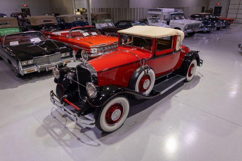 This 1930 Pierce-Arrow Model B Convertible Coupe is a wonderfully luxurious pre-war convertible and is certified by the Classic Car Club of America (CCCA) as a "Full Classic." From modest mid-19th Century origins, few could have expected a small Buffalo-based birdcage and ice box manufacturer would become one of the most distinguished pre-War automobile builders who still today has left a lasting legacy of design on automotive design in the United States and across the globe. At the turn of the 20th century, Pierce-Arrow was renowned for its technological advancements, high-end build quality, and iconic design, highlighted by the iconic fender-embedded headlight that was patented by the company in 1913 and would eventually become the universal standard in the US by the 1940s. However, by the late 20s, Pierce-Arrow had slipped behind its rivals Cadillac and Packard with regards to technological innovation, specifically in the fact that both Cadillac and Packard were selling 8 cylinder engines whereas P-A only offered a 6 cylinder engine. In 1928, after facing months of financial trouble Pierce-Arrow sold to Studebaker making the combined companies the 4th largest American auto group. Despite the merger, Pierce-Arrow seemed to operate independently from its lower-priced parent company. Then in 1929, the company released the Pierce-designed straight 8, leading what appeared to be a resurgence in sales at Pierce-Arrow and the best sales year in the company's history. Coming off this massive success, Pierce-Arrow released 3 new models, with 3 different engines, on 4 different wheelbases for the 1930 model year, comprising 18 distinct body styles. In retrospect, there were far too many choices in a time where the company would have been better off keeping its offerings simple and limited, due to Depression-induced financial uncertainty and likely a shrinking customer base. While Pierce-Arrow's momentum was slowed by the onset of the Great Depression, sales still remained fairly strong in 1930 with total production sitting a tad shy of 7,000 cars. Due to its status as a fine and distinctive automobile, the Classic Car Club of America has designated this 1930 Pierce-Arrow as a Full Classic meaning that it's eligible to participate at CCCA events and CARavans. This particular Pierce-Arrow Convertible Coupe comes to us from a prominent museum collection where it was well maintained. Powering this '30 Pierce-Arrow Convertible Coupe is a 366 cubic inch L-Head Inline 8 cylinder engine fed by a single 2 barrel Stromberg updraft carburetor that together were rated at 125 horsepower from the factory. The 366 CID Straight 8 is mated to a 3 speed manual transmission that is shifted with a floor-mounted shifter. Exhaust exits this Pierce's power plant via a single exhaust port, generating a surprisingly quiet rumble out the rear as is often touted by Pierce-Arrow enthusiasts. For an early '30s pre-war automobile, this Model B Convertible Coupe is well-optioned. A rear-mounted luggage rack makes this Pierce-Arrow a wonderful choice for overnight CARavans since you can bring along your belongings. Riding on a set of wide whitewall tires mounted on optional wire wheels and accented with chrome hubcaps, this Pierce Arrow Convertible Coupe has a truly upscale look. Further adding to high-end look of this Pierce-Arrow are dual side-mounted spare tires available should you need them, and each are topped with optional side mirrors that provide improved visibility down the sides of this CCCA Full Classic. The tan cloth convertible top comes outfitted with a glass rear window and, like all convertibles in this era, it's raised and lowered by hand. Supplementing the iconic Pierce-Arrow fender-embedded headlights are a pair of auxiliary fog lamps that provide additional visibility in low light driving. The exterior of this Model B Convertible Coupe has a wonderfully sporty look, comprised of a Crimson Red painted body and louvered hood, with black accents and red pinstripes contrasted by the black painted fenders with red edge piping. The interior of this 1930 Pierce-Arrow Model B Convertible Coupe is also quite luxurious. The front seat along with the rear rumble seat have been refurbished in medium tan upholstery. The matching door panels, wooden trim, black carpeting, steering wheel, and woodgrain-trimmed dash all retain a nice stock appearance on this wonderful pre-war Classic. Instrumentation includes a rotary-style speedometer, temperature gauge, amp gauge, oil pressure gauge, and gasoline gauge, as well as a clock by Waltham. The dash is finished off with various other vehicle controls as well as a couple of chrome map lights. Whether you're buying your very first classic car or you're a card carrying CCCA member who's looking to add a great driver to their stable of Full Classics, this 1930 Pierce-Arrow Model B Convertible Coupe would make a great choice. Give Ellingson's call today at 763-428-7337!