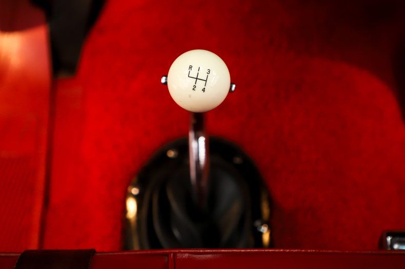 INTERIOR: Wow, the factory code 747 medium red interior pops! He had a reproduction interior installed including door panels, seat upholstery and carpet. The dash is all restored: instrument bezels, dash pad, heater control panel and a deluxe steering wheel. Inside the glovebox is new with the manuals. It has a factory AM/FM with factory kick panel speakers. Down on the floor it has original red seat belts, red floor mats and best of all the correct 4-speed shifter! The headliner, visors and mirror were replaced although there are 2 holes.