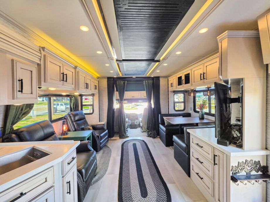 2021 Newmar Super Star 4061 Class Super C Motorhome This 2021 Newmar Super Star 4061 is a luxury diesel Class Super C motorhome that delivers top-tier comfort, performance, and off-grid capability. With approximately 17,600 miles, this coach was ordered with all available factory options, including a dishwasher, washer and dryer, on-demand hot water system, 50,000 BTU Aqua-Hot Oasis heating system, Aqua-Miser shower system, and multiple Samsung TVs paired with Bose and JBL surround sound. The interior was professionally customized by an interior decorator and features upgraded black reclining chairs, an enhanced dinette with added cushioning and storage, a custom headboard, and a new Leesa king-size mattress. Off-grid capability is exceptional with heated tanks, an 8kW Onan generator, diesel Oasis furnace and water heater, and a professionally installed 1,200-watt solar system with Victron monitoring and two 300Ah lithium batteries capable of running all appliances continuously. The Freightliner chassis was custom-adjusted by a top dealer to improve steering and turning radius by 15 percent. With a 20,000-pound towing capacity and three slide-outs, this Super Star is built for extended luxury travel.