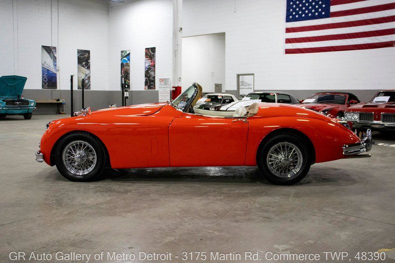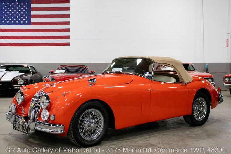 GR Auto Gallery is pleased to present this beautifully restored 1958 Jaguar XK150 for your consideration. Finished in stunning Ferrari Red over a crisp White interior, this XK150 is a true British sports car icon with just 1,052 miles since its comprehensive frame-on restoration was completed in 2000, with receipts documenting parts and labor. Power comes from the original 3.4 liter inline 6 cylinder engine featuring dual SU carburetors, paired with a desirable 4-speed manual transmission. This Jaguar is equipped with four wheel disc brakes, a stainless steel exhaust system, 16-inch knock-off wire spoked wheels wrapped in Pirelli 225/60R16 tires, chrome front and rear bumpers, Smith gauges, a functional dash clock, and a classic four-spoke steering wheel. Additional highlights include a tan cloth soft top, crank windows, a spacious trunk, car cover, and its exceptionally clean, well-cared-for presentation throughout. Drive this one out of our showroom or have us assist with shipping it to you anywhere in the United States! Don't hesitate to call us with any questions or for more information.