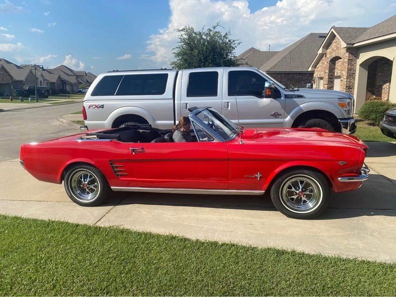 This 1966 Ford Mustang Convertible is a restored example with an all numbers matching drivetrain. It presents in a bright red exterior with a white convertible top and classic Mustang styling throughout. The black interior shows bucket seats and a clean, well-kept cabin layout. It is equipped with an automatic transmission, along with an aluminum radiator and an electric fan as part of the restoration. The odometer shows 2,600 miles.