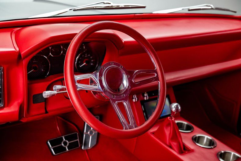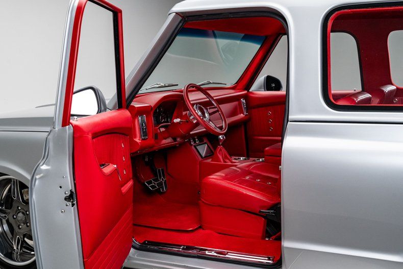 Inside, the Blazer's custom red interior creates immediate contrast against the silver exterior. Front bucket seats and a matching rear bench are upholstered with custom pleating and distinctive grommet inserts, giving the cabin a tailored, high-end feel. The dash has been completely smoothed and reimagined, incorporating gauges inspired by the GMT K2XX platform for a contemporary OEM-plus aesthetic. A billet steering wheel with a matching red grip anchors the driver's position, while a custom center console integrates storage, cupholders, and a monitor that displays a rear-view camera. Hidden switches beneath the dash maintain the clean design, and Vintage Air controls provide modern climate comfort. The door panels and interior trim are upholstered to the same exacting standard as the seats, and a custom Alcantara headliner accented with billet detailing completes the interior's cohesive execution.