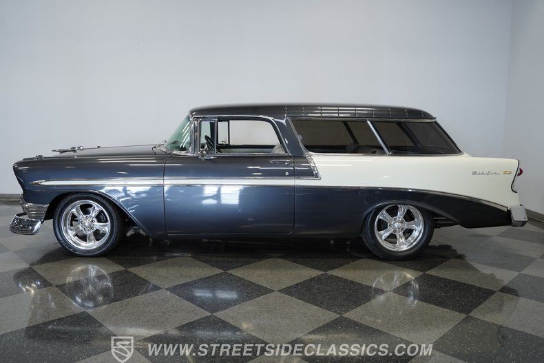 It's arguably one of the most iconic rides Chevy ever created. Just one look at this 1956 Chevrolet Nomad is all it takes to conjure up images of a simpler time, full of carefree adventuring. Revitalized in a Charcoal Gray Metallic over Cream color scheme, with some added metallic flakes in the gray section to catch the sun to perfection, this is a great looking classic. It features a tastefully lowered stance and its set of ultra-sharp 17" Billet Specialties wheels adds the perfect finishing touch. This vintage Chevy's chrome bright work is in fine condition, including the telescoping chrome antenna, the window tinting retains nice, even coloring and a closer inspection will confirm that its door seals and window trim are pliable and have kept any potentially intruding elements at bay.