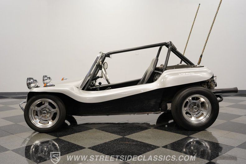 Power comes from a lively 1600 CC Flat-4 engine equipped with dual Weber two-barrel carburetors and paired with a 4-speed manual transmission. Factory-style front and rear suspension keeps the ride classic, while aftermarket lowering shocks give it a more aggressive stance. Custom 15-inch alloy wheels are wrapped in 145/65R15 tires up front and wider 235/65R15 tires in the rear for a planted look. Manual drum brakes provide reliable stopping power. Long tube headers, dual exhaust, and aftermarket mufflers give the buggy that unmistakable air-cooled sound every enthusiast loves.