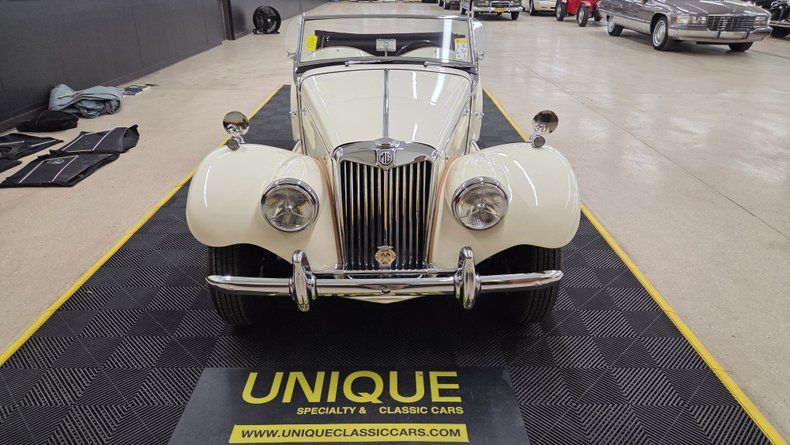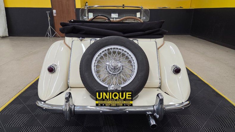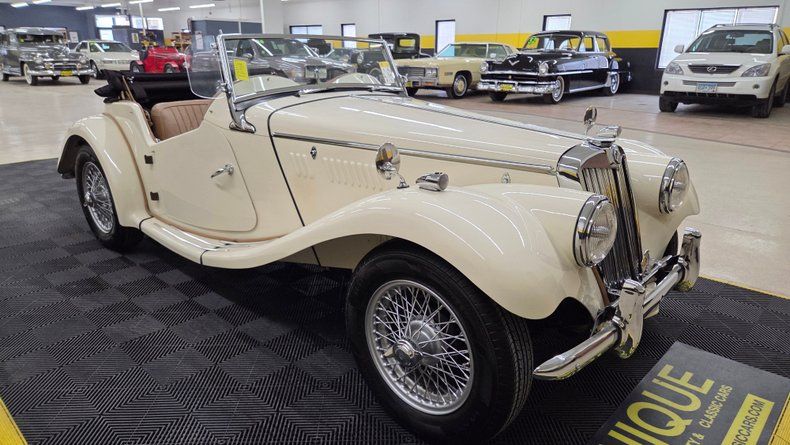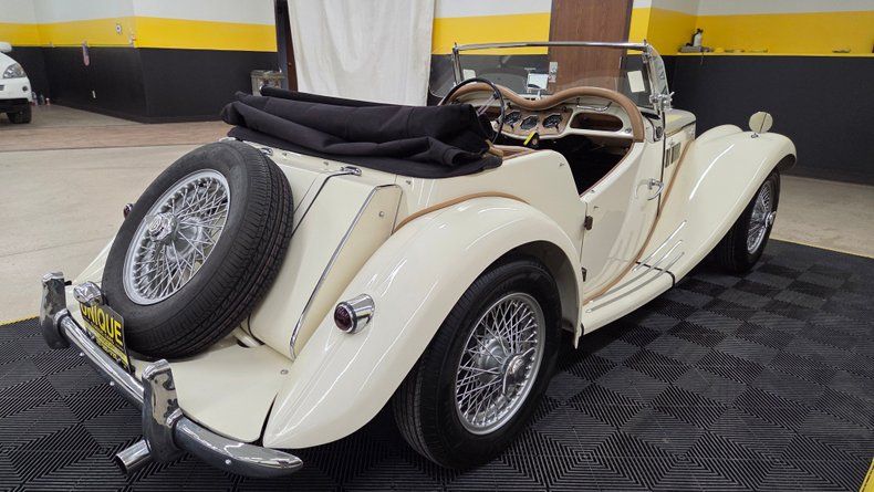 1954 MG TF. Unlike many replicas or kit cars, this MG TF is the real deal, featuring an inline four-cylinder engine mounted in the front and a full steel body, distinguishing it from replicas. The car is painted in a cream/off-white color with a tan interior, complemented by chrome brightwork and wire-spoked wheels with knockoffs. A shifter is mounted on the floor for the four speed manual transmission. Overall a well-maintained and shiny finish with few imperfections. Included with the car are accessories such as side curtains (windows), storage bags, a cockpit cover, a car cover, and manuals for both workshop and restoration purposes. The rear features a mounted spare tire matching the wire wheels, and the car has "suicide" doors that open opposite the standard direction. Recent service includes new front brake shoes, and new front wheel cylinders. The inner tie rods could use attention and the speedometer and odometer are not operational. The engine starts easily with a choke (for cold starts) and manual starter pull mechanism. The manual folding convertible black fabric top folds well and the the side curtains slide into place as they should. The engine is equipped with dual carburetors and under the hood is a toolbox with necessary tire-changing tools such as a mallet and jack. On the road, the MG TF shows good drivability with smooth running, responsive handling, and comfortable accommodation even for a taller driver. Gauges such as water temperature, oil pressure, tachometer, and ammeter are reading.