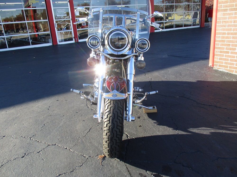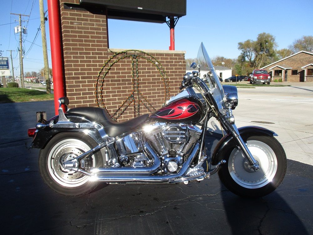 With its fat FL forks, wide 16 tires, broad handlebars and chrome 7 headlight nacelle this softail is anything but skinny. Its distinctive look will get you noticed in a crowd. The 2002 Fat Boy has a 1450cc Twin Cam V-Twin mated to a 5 speed manual transmission. You will also appreciate the driver floor boards, solid disc wheels, FL rear fender and the optional fuel injection which this bike is equipped with. This particular example has also been nicely upgraded with a long list of chrome which includes the rear swing arm, front forks, axle covers, frame inserts, swingarm bolt covers, upper and lower belt guards, shift levers, hand levers, horn cover, switch housing covers and chrome fender tips with gold H-D Eagles. It has a full custom paint job with custom tribal graphics, Daymaker LED headlight and passing lamps, smoked turn signals, a sweet low profile H-D seat with custom stitching, a matching QR passenger backrest, a QR windshield, Carlini beach bars, upgraded floor boards with a matching brake pedal, matching grips and pegs, flamed mirrors as well as flamed covers for the master cylinder, inspection cover and primary cover. To top it off it has a Stage I Hyper Charger and it sounds just plain nasty ripping through its Vance & Hines Short Shot performance exhaust system. Less than 1,000 miles ago it received new tires, brakes and a battery. Within the last 5 miles it was fully serviced and inspected and everything is in perfect working order. We have priced it fairly