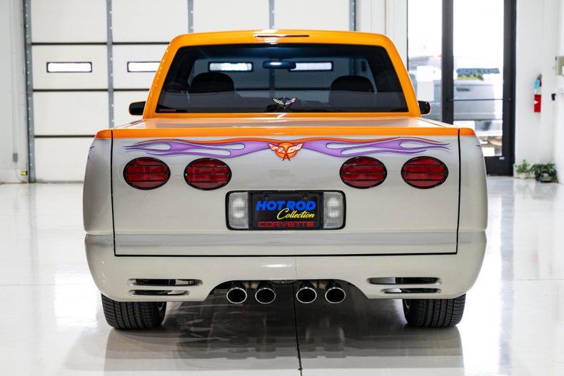 For example, it features a high-end Whipple Supercharger system with matching Whipple EFI The entire system, including the ceramic-coated headers, are CARB-legal in all 50 states. The exterior received many styling upgrades as well, including a hydraulically actuated fiberglass tonneau cover with molded-in rear spoiler, a flush tailgate featuring Corvette taillights, a louvered lower valence panel, and a steel cowl-induction hood, all finished with a show-quality custom paint job featuring multi-color candy flame accents and color fades. The interior received custom-stitched leather with Corvette-Logo embroidered seats, along with custom door panels stitched with flame graphics to match the exterior.