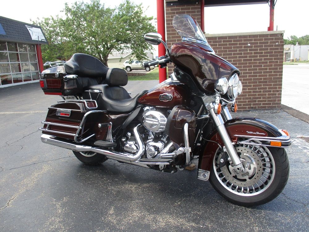 The 2011 Harley Davidson Electra Glide Ultra Classic enables the Harley enthusiast to enjoy ultimate comfort during longer trips. Not only does it have classic Harley Davidson curb appeal but it also boasts top of the line accessories with the ability to carry more gear and go longer distances with a 6 gallon tank making this the perfect motorcycle for long trips. Standard equipment includes a Harmon Kardon 80 watt sound system with passenger controls, a CB, an intercom system, vented lower fairing, adjustable fairing deflectors and electronic cruise control. This particular example was optioned in a gorgeous two-tone Light & Dark Candy Root Beer that just sparkles in the sunlight. It has been equipped with a long list of upgrades which include the TRU HIDS headlight and passing bulbs, a tinted 11 VStream windshield, saddle bag lid guards, a tour pak luggage rack, a push button gas door, a driver backrest, highway pegs, adjustable passenger highway pegs, passenger grab rails, upgraded derby & timer covers, driver & passenger cup holders, an extra loud horn, upgraded H-D grips and upgraded H-D mirrors with integrated blinkers. You will also appreciate the Stage I air cleaner, the Power Commander and it sounds just plain nasty ripping through its Vance & Hines headers and Monster Oval Exhaust. All said and done thousands have been spent on upgrading this bike yet we have priced it as if it were stock. If you like what you see we suggest contacting us before it is too late!
