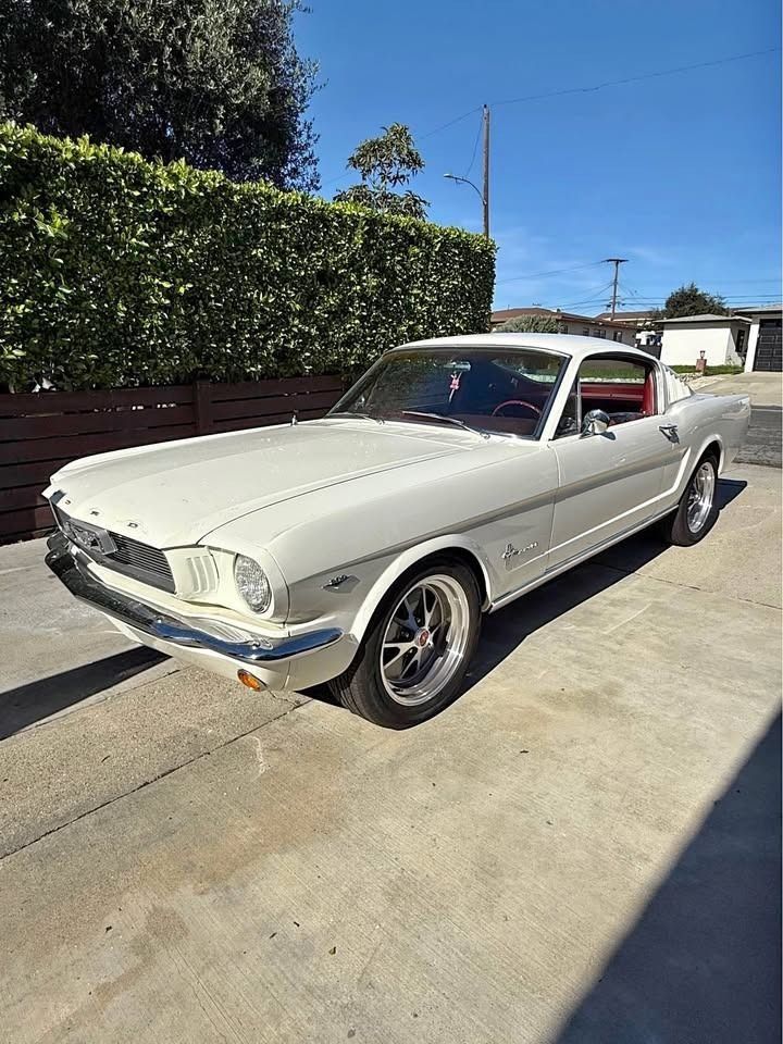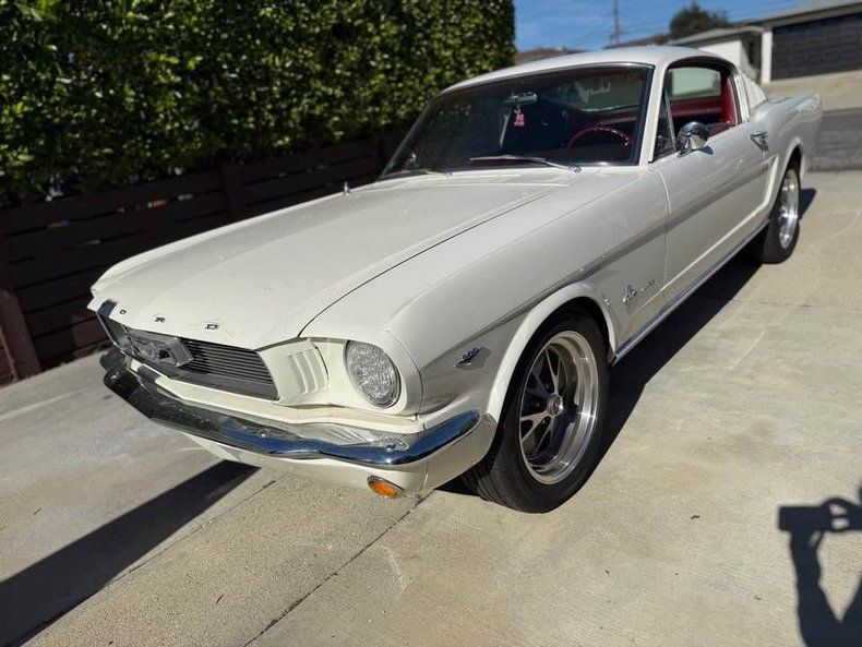 This 1966 Ford Mustang Fastback is a nicely restored classic finished in Wimbledon White with a red interior. It is powered by a 302 cu V8 built specifically for this car and paired with a rebuilt automatic transmission. The engine has only 80 miles, while the vehicle shows 300 miles. This Mustang features all new interior components, new seats, a new radio, all new electrical, disc brakes, new rims, and new tires. As noted, the paint is rated 9/10, and the car has no significant damage or problems reported. It also comes with its original license plates, VIN marked in the engine bay, and identification numbers on the driver's door. Overall, this Fastback presents as a sharp, well-sorted build with desirable color combination and strong visual appeal.