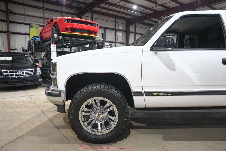GR Auto Gallery is excited to present this 1995 Chevrolet K1500 Silverado Z71 Off Road finished in Pearl White over a Black leather interior. This regular cab pickup carries the timeless styling that made the GMT400 generation trucks some of the most recognizable and beloved pickups of the 1990s. The Pearl White paint pairs nicely with the chrome bumpers and chrome grille, giving the truck a clean and classic appearance. The truck underwent full body repair and a professional repaint, and the finish today shows extremely well with paint that is near perfection. The body is very solid with no surface rust present underneath and all floor pans in good condition. Exterior updates include a new grille, new headlights and taillights with LED lighting upgrades, new front and rear bumpers, body side molding kit, wheel arch moldings, new door latches, fresh window tint, and a new windshield. Sitting on chrome XD Series wheels wrapped in Nitto Ridge Grappler HD tires and topped off with a Mostplus tonneau cover, the truck has a strong stance while still keeping the classic Silverado look.