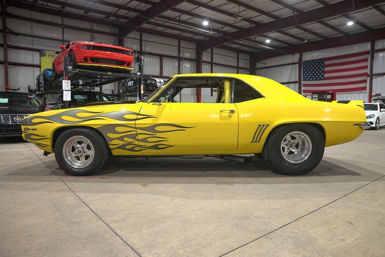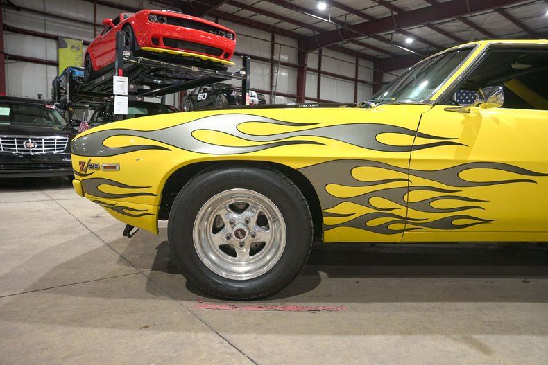 GR Auto Gallery is excited to present this 1969 Chevrolet Camaro Z28 finished in bright Yellow with aggressive black striping and custom flame graphics. The exterior makes an immediate statement with grey flame accents on the front side panels and a split stripe design flowing down the top of the car featuring checkered gold flake metallic flames on the hood. Classic 302 hood emblems nod to the original Z28 heritage while the staggered stance with Mastercraft front tires and Mickey Thompson rear tires mounted on Weld Racing 5 spoke wheels reinforces its purpose built muscle car attitude.
