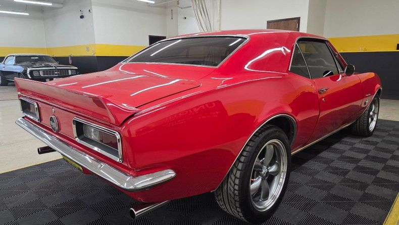 1967 Chevrolet Camaro Coupe. A well-maintained Gen 1 Camaro represented as an SS tribute. It features a 383 stroker engine with headers and Flowmaster exhaust. Equipped with an automatic transmission shifted on the center console with a ratchet style shifter. Featuring power steering, power brakes, and a cold-blowing air conditioning system with a great looking and functional serpentine belt setup, and great looking CVF aluminum hood hinges. Glossy bright red paint with some imperfections. Riding on five-spoke torque thrust wheels and BF Goodrich radial tires. The black vinyl interior is in great condition, featuring factory bucket seats, a center console, seat belts, an aftermarket tachometer, and gauges for oil pressure and temperature. New rear brakes and wheel cylinders, the radio and wipers are non-functional, and the speedometer reads slightly slow. The engine bay is clean and attractive, showcasing an MSD ignition system, a Holley four-barrel carburetor with electric choke, an aluminum radiator with dual electric fans, and a battery disconnect switch for storage convenience. The car comes with a car cover and a binder containing a history of paperwork and receipts. Smooth running engine and strong exhaust note. On the road the responsive and quick acceleration, effective and smooth braking, and flat cornering, all contributing to an enjoyable driving experience.